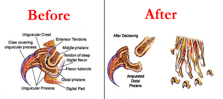 Contrary to what most people believe, cat declawing means amputating not just the claws (not possible), but cutting the toe up to the joint, including bones, ligaments, and tendons! To remove the claw, the bone, nerve, joint, ligaments, and tendons must all be amputated. So you can see that declawing is not just a single surgery but 10 separate, painful amputations.
