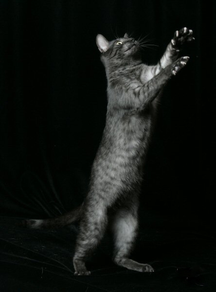 When happy, these beautiful felines make soft chortling sounds and comically wiggle their tails. Active cats, Maus love to play with moving things. Chasing “prey” is a favorite game, and a laser pointer allows for unlimited play, especially at dusk.