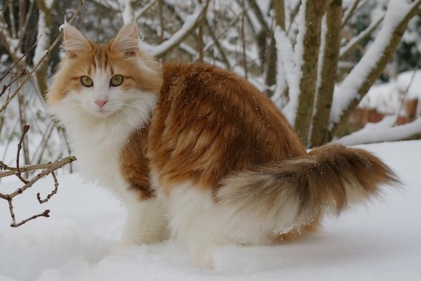 Naturally evolved to suit its environment, the Norwegian Forest Cat is a large and robust breed. The coat has two layers. The outer coat is silky, and in winter has a thick underlayer, a full ruff around the neck and britches along with the expressive and gloriously plumed tail carried proudly the whole year round.