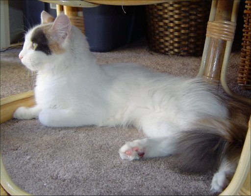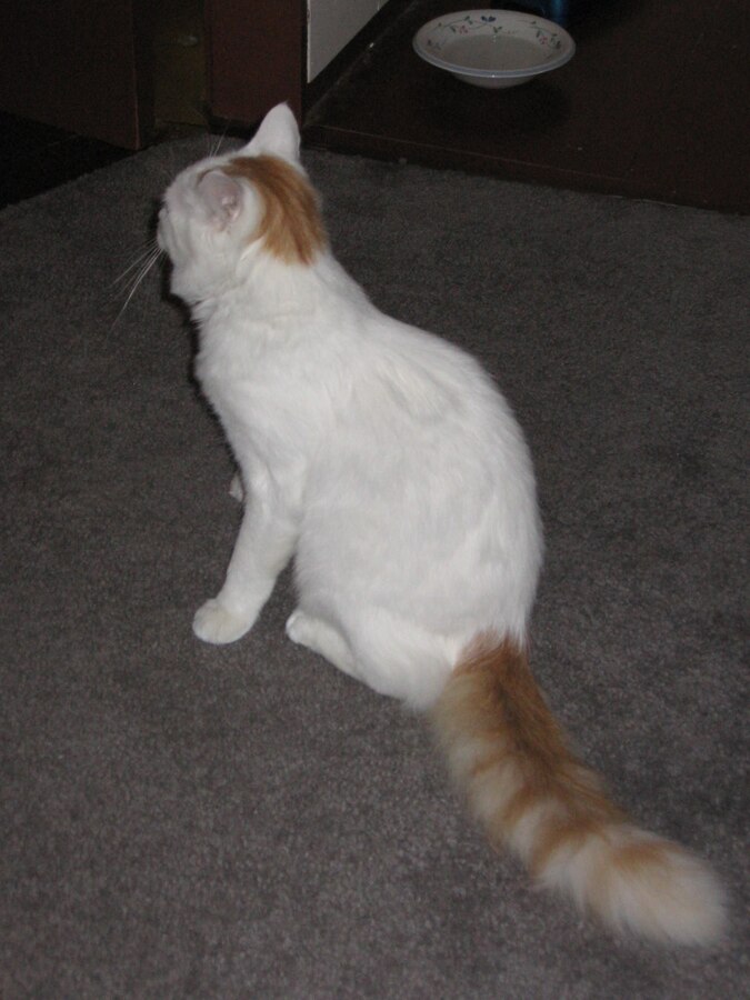According to the CFA, the coloration of the Turkish Van cat (which is considered by many to be the original breed to carry the piebald gene) calls for a white, semi-longhaired cat with colored markings restricted primarily to the head and tail. This cat has been known by several names throughout its evolution such as the white ringtail and the Russian longhair.